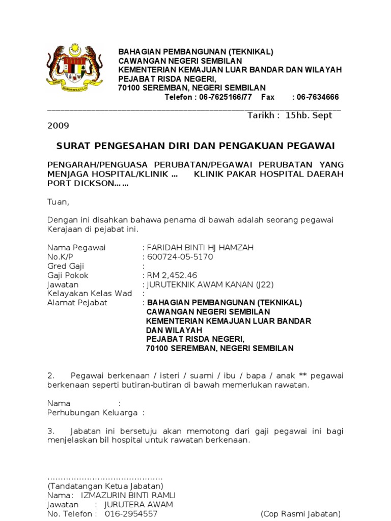 Berikut dikongsikan contoh yang mudah dan ringkas beberapa surat rasmi makluman. Contoh surat cuti kerja dari majikan have a graphic associated with the. Surat pengesahan diri dan pengakuan pegawai.
